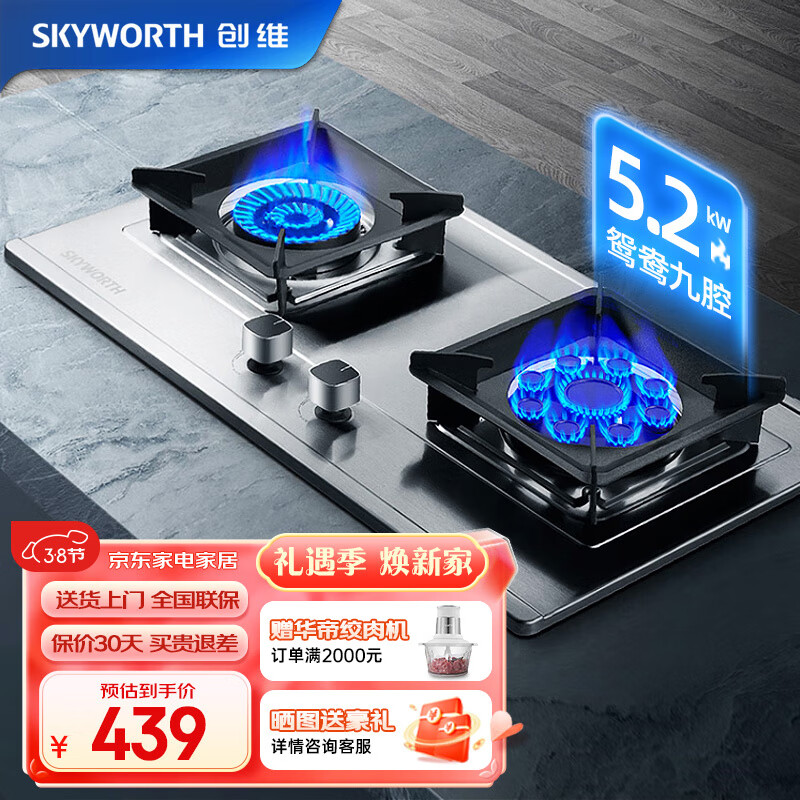 创维(Skyworth)燃气灶双灶具家用5.2KW猛火九腔鸳鸯聚能爆炒炉具台式/嵌入式两用不锈钢灶台JZT-Z61(天然气)价格:439.00元!