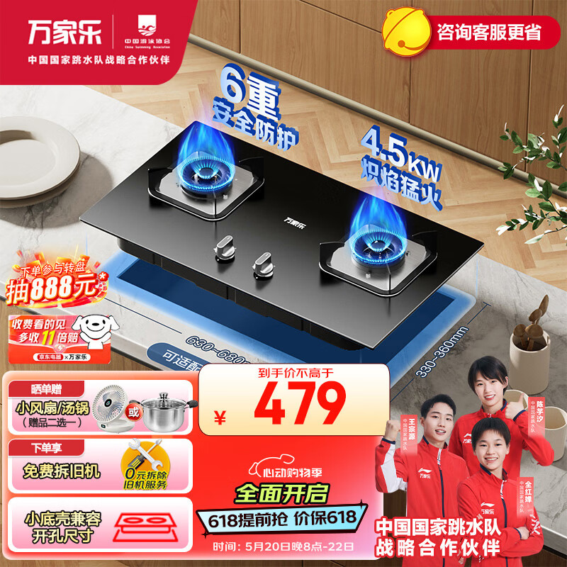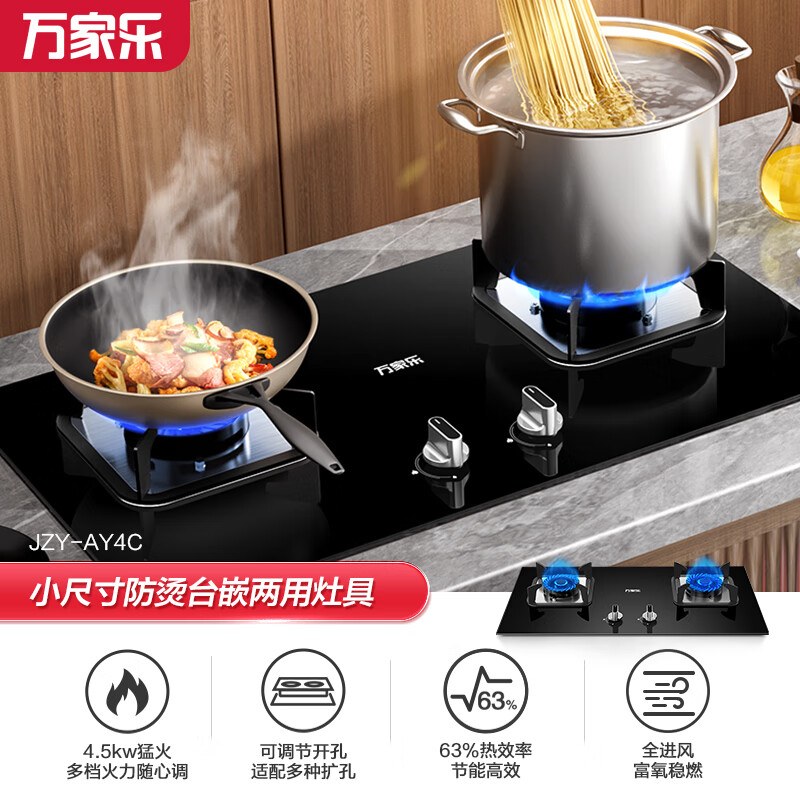 万家乐燃气灶 4.5kw大火力 台式嵌入式两用煤气灶双灶 可适配开孔尺寸 钢化玻璃全进风液化气灶JZY-AY4C价格:579.00元!