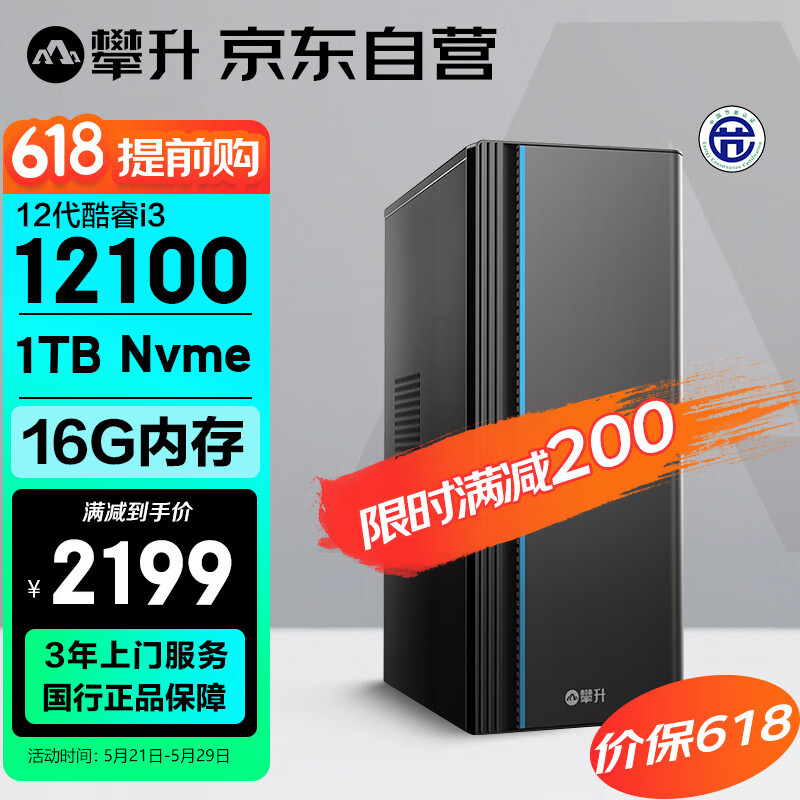 攀升 商睿3 办公商用家用台式电脑台式机组装电脑主机全套(12代酷睿i3 16G 1TB WiFi)价格:2399.00元!