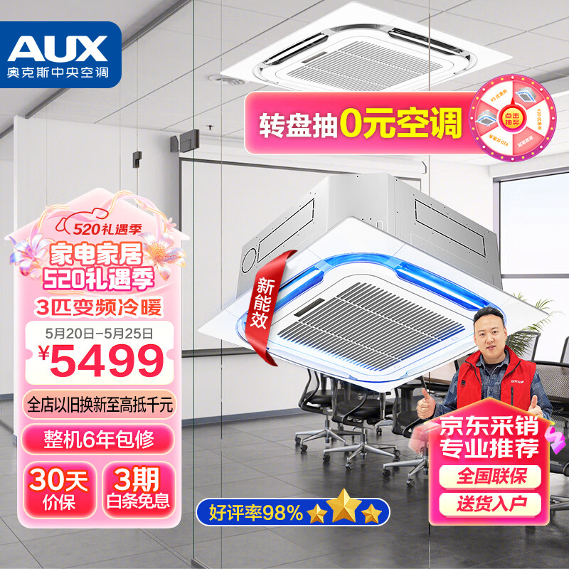 奥克斯(AUX)中央空调一拖一 天花机3匹变频冷暖吸顶空调嵌入式吊顶空调商用天井机220V KFR72QW/BPR3YD(B3)-G价格:5499.00元!