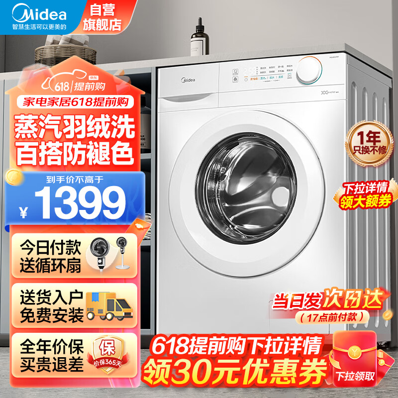 美的(Midea)滚筒洗衣机全自动白色10公斤食用级除菌BLDC变频节能95°高温筒自洁 以旧换新MG100V11F[官方直发]价格:1388.00元!