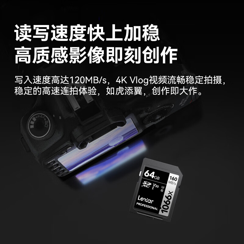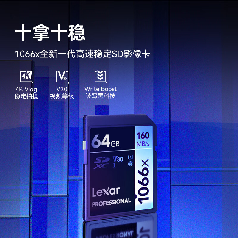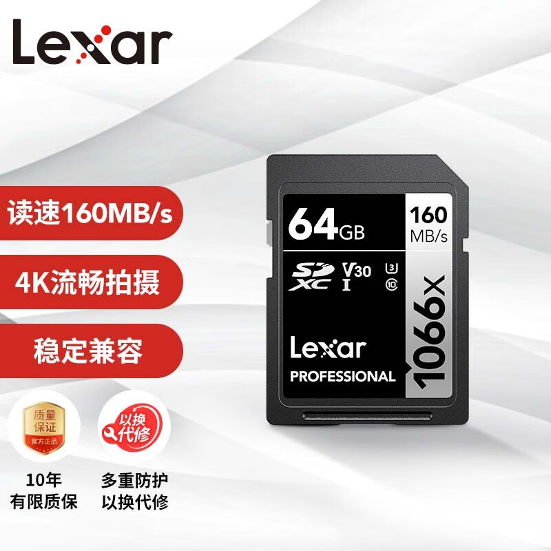 雷克沙(Lexar)64GB SD存储卡 C10 U3 V30 读160MB/s 写70MB/s 快上加稳4K流畅拍(1066x)价格:129.00元!