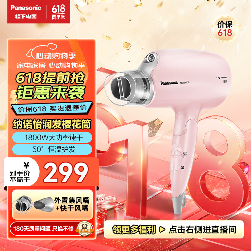 松下(Panasonic)电吹风机大功率高速大风力低噪音速干送老婆折叠便携 纳诺怡水润护发电家用吹风筒EH-WNA3B价格:299.00元!