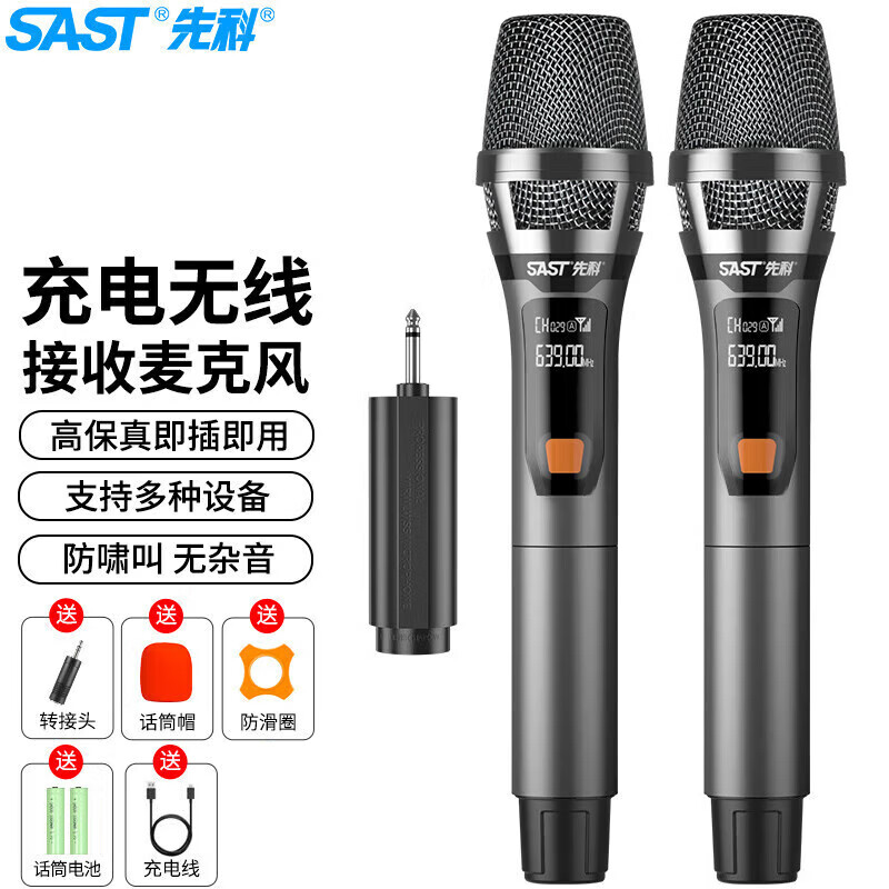 先科 SAST OK-93B充电无线麦克风U段家庭KTV唱歌舞台主持演讲K歌会议音箱音响功放调频一拖二金属话筒价格:223.00元!