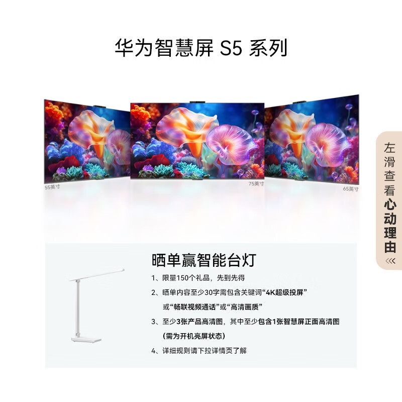 华为智慧屏 S5 65英寸 4K超级投屏 144Hz鸿鹄画质高清超薄智能液晶游戏电视机HDB5266H价格:4299.00元!