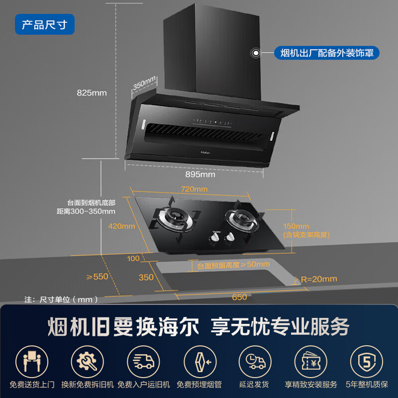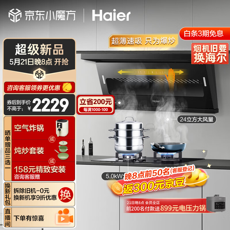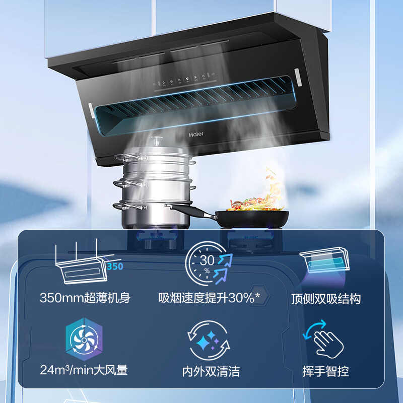 海尔(Haier)抽油烟机 顶侧双吸烟灶套装 24m3/min大吸力 5.0kw家用厨房吸油烟机燃气灶具套装C51+Q2BE2天价格:2429.00元!