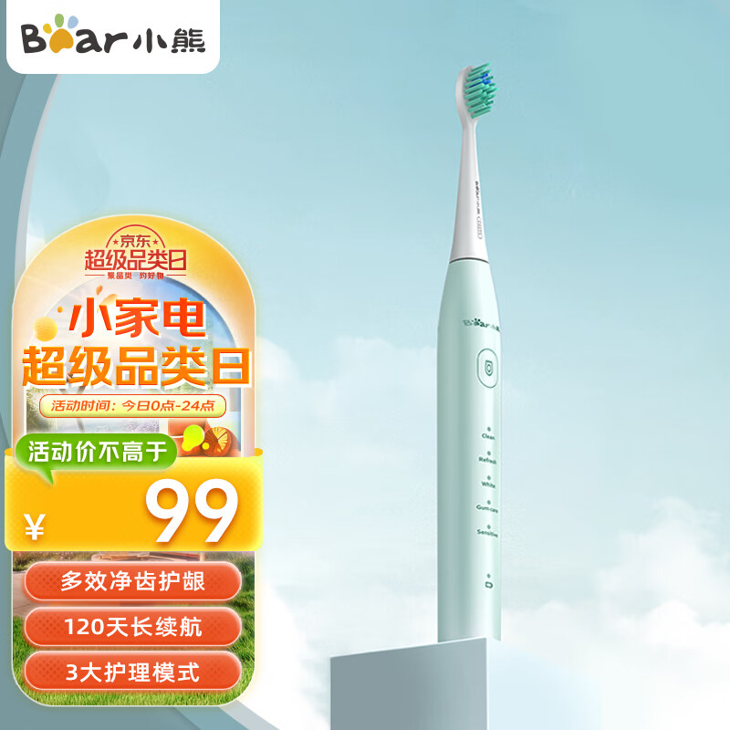 小熊(Bear)电动牙刷 牙医推荐声波牙刷 情侣款礼物送男/女士 成人家用深度清洁 便携 C02T5【绿】价格:149.00元!