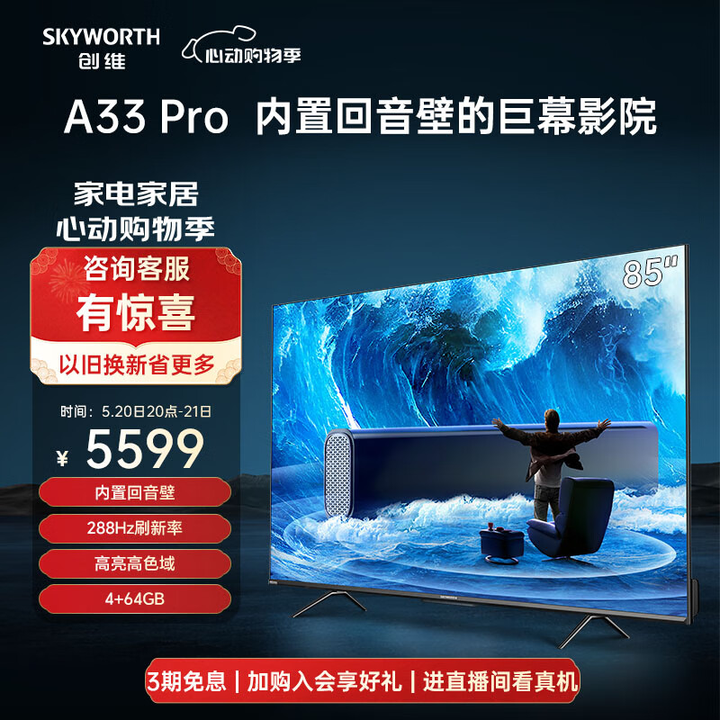 创维 电视85A33 Pro 85英寸内置回音壁288Hz高刷4K超薄护眼声控屏智能液晶游戏电视机价格:5999.00元!