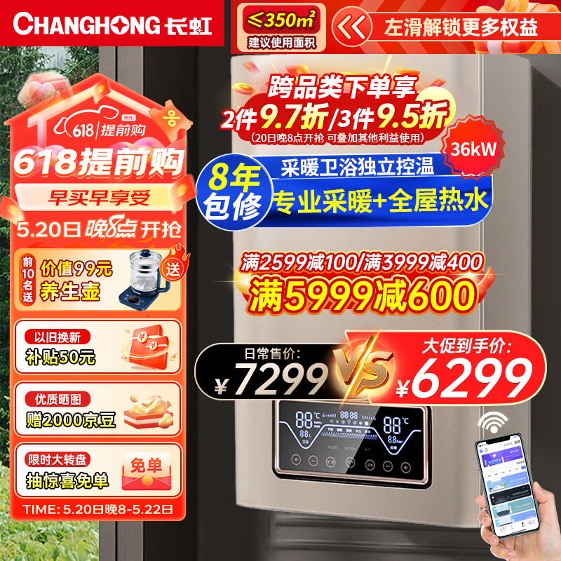 长虹(CHANGHONG)燃气壁挂炉家用天然气双温双控供暖淋浴APP智控多段式燃烧锅炉供暖暖气片地暖热水两用恒温36BQ01价格:7299.00元!