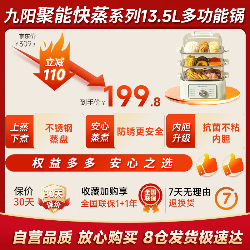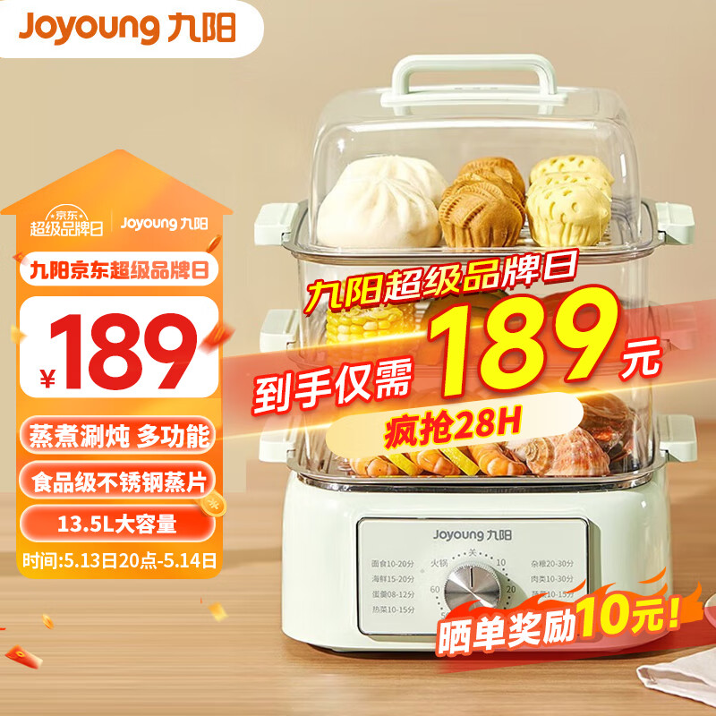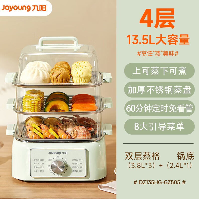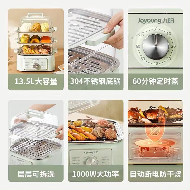 九阳(Joyoung) 电蒸锅蒸煮一体304不锈钢家用多功能多层大容量蒸笼多用途锅电火锅电煮锅料理锅智能定时 蒸片不锈钢GZ505【大容量不粘内胆】 13.5L价格:309.00元!
