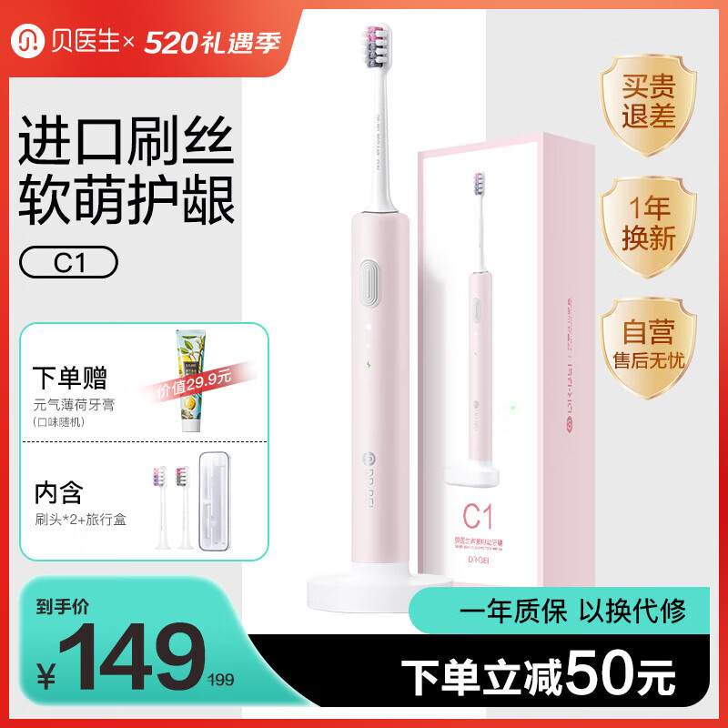 贝医生(DR·BEI) 电动牙刷成人声波震动智能软毛牙刷情侣款防水全自动牙刷充电式C1 洗漱旅行套装 国货520礼物 C1 少女粉(旅行盒+清洁刷头+敏感刷头)价格:149.00元!