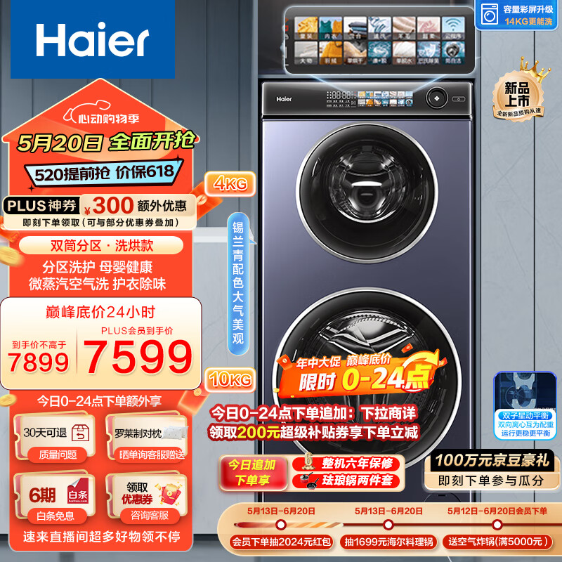 海尔(Haier)滚筒洗衣机全自动 母婴双筒双子分区 4+10公斤 家用洗烘一体机 内衣洗 以旧换新XQGF140-HB1268U1价格:8099.00元!