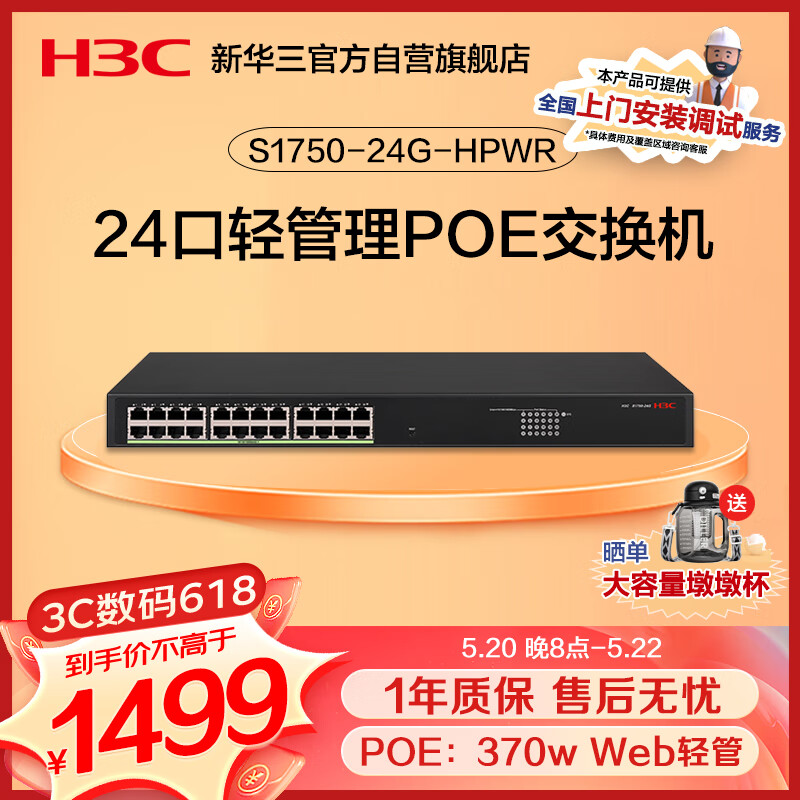 华三(H3C)24口千兆POE供电网络监控交换机 Web轻管理/POE370W S1750-24G-HPWR价格:1499.00元!