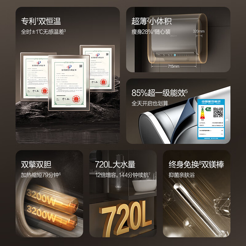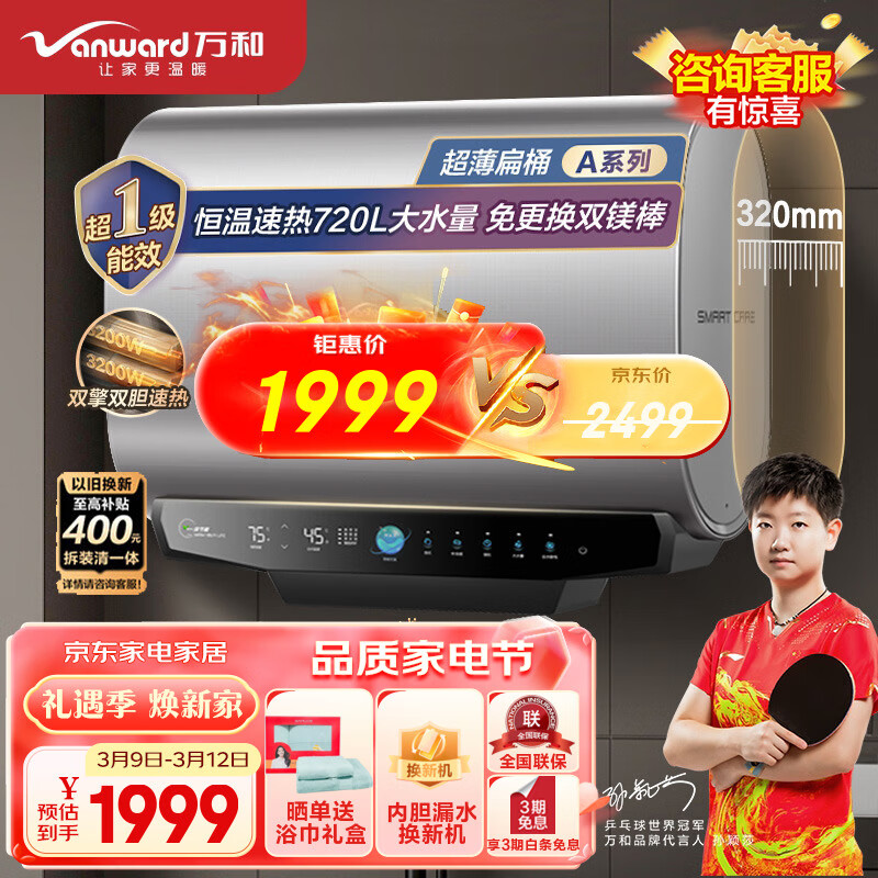 万和(Vanward)60升超薄扁桶电热水器出水断电双擎双胆速热3200W一级能效智能恒温增容镁棒免更换 E60-A7WW30-32价格:2499.00元!