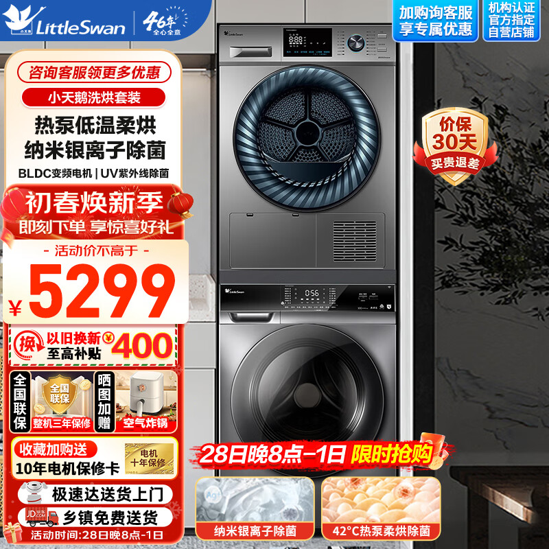 小天鹅(LittleSwan)洗烘套装10公斤全自动变频滚筒银离子除菌洗衣机+10公斤热泵烘干机TG100VC62WADY+VH868价格:5299.00元!