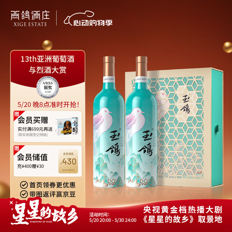 西鸽酒庄玉鸽国彩蓝国产干红葡萄酒750ml*2瓶礼盒装 宁夏贺兰山红酒送礼价格:388.00元!
