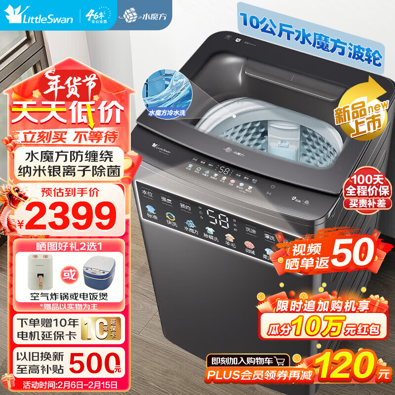 小天鹅(LittleSwan)波轮洗衣机全自动 10公斤 水魔方防缠绕 直驱变频 炫彩大屏 TB100ACTEC价格:2369.00元!