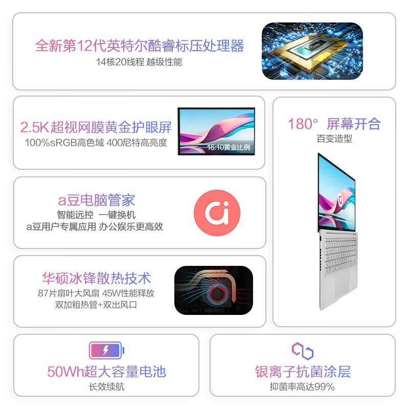 华硕笔记本电脑a豆14 Pro 2.5K超清高亮屏 轻薄本商务办公本(14核i7-12700H 16G 512G 100%sRGB高色域)价格:5699.00元!