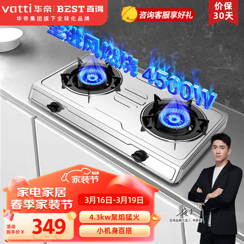 百得(BEST)华帝出品4.3KW大火力 不锈钢台式 全进风家用燃气灶煤气灶双灶 猛火双眼灶TE01液化气价格:349.00元!