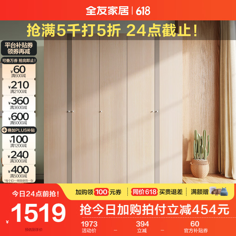 全友家居 衣柜现代简约平开门衣柜北欧卧室五门衣柜106305 五门衣柜价格:1579.00元!