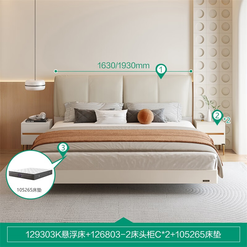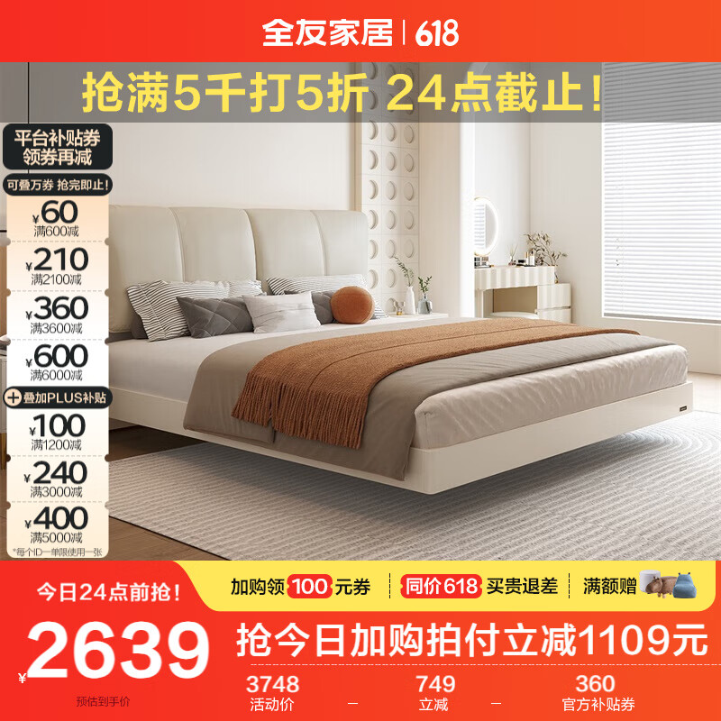 全友家居 现代简约大象耳朵皮艺软包床1.8米主卧室双人悬浮大床129303价格:3748.75元!