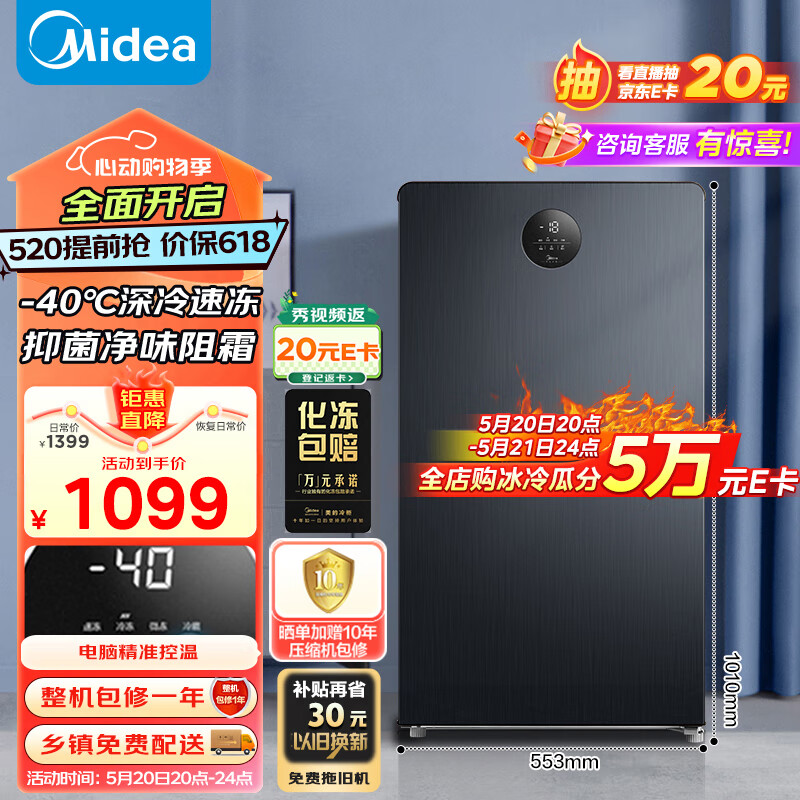 美的(Midea)120升节能家用立式冰柜-40℃深冷电子控温冷藏冷冻转换 抽屉式小型全冷冻冰箱冷柜 BD/BC-120UEM价格:1199.00元!