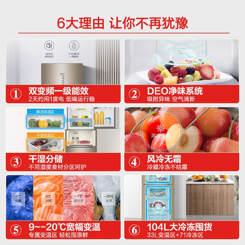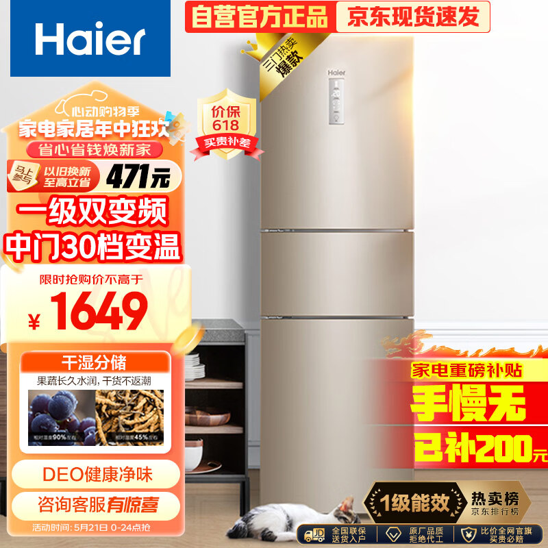 海尔(Haier)223升风冷无霜三开门多门电冰箱小户型家用宿舍出租房 一级能效节能省电低噪中门变温BCD-223WDPT价格:1649.00元!