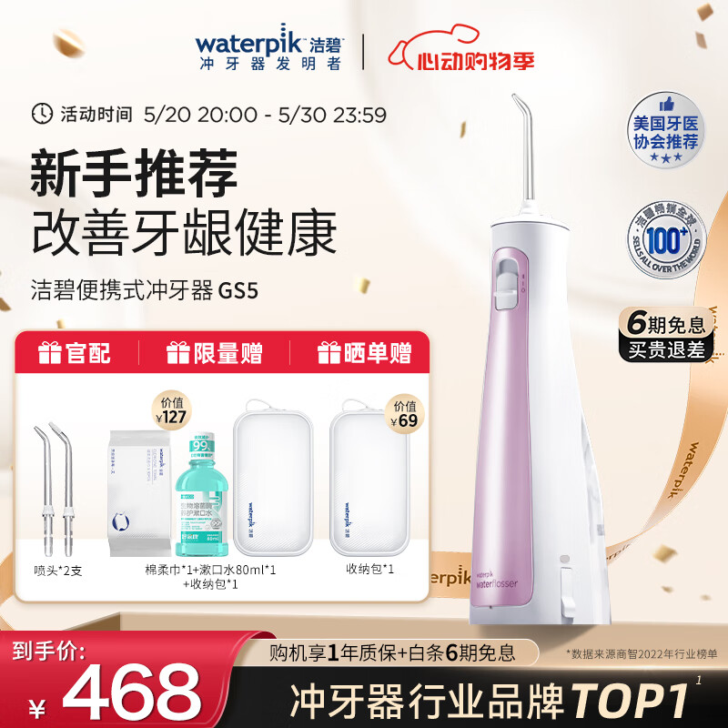 洁碧(Waterpik)冲牙器便携式电动洗牙器水牙线洁牙器 家用立式预防牙结石全身水洗极光系列 GS5粉 520礼物价格:468.00元!