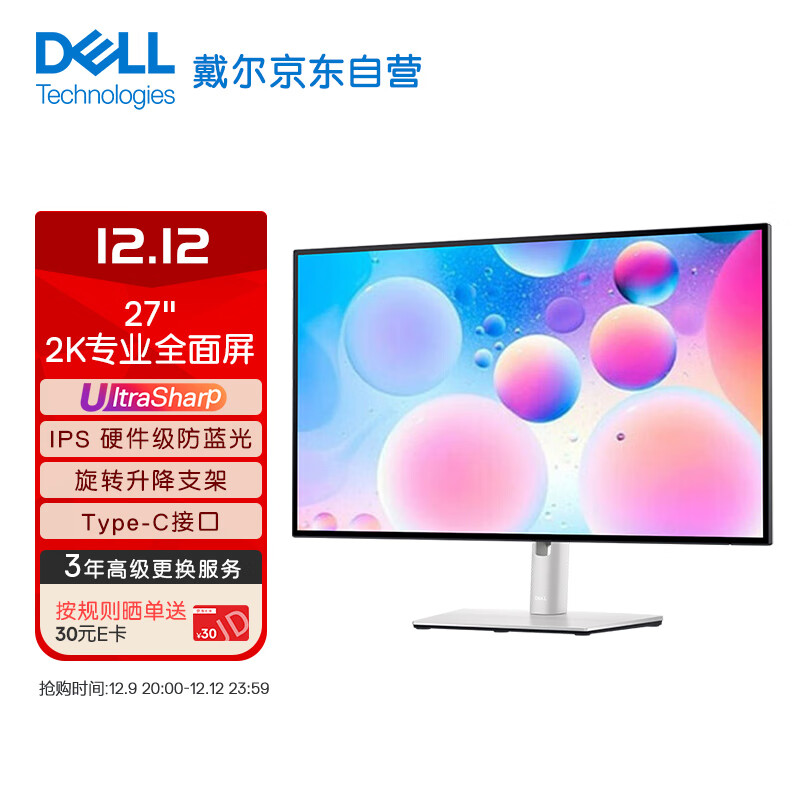 戴尔(DELL)UltraSharp 27英寸 2K显示器 IPS 防蓝光 Type-C15W手机充电 旋转升降 四边微边框 U2722D价格:2572.00元!