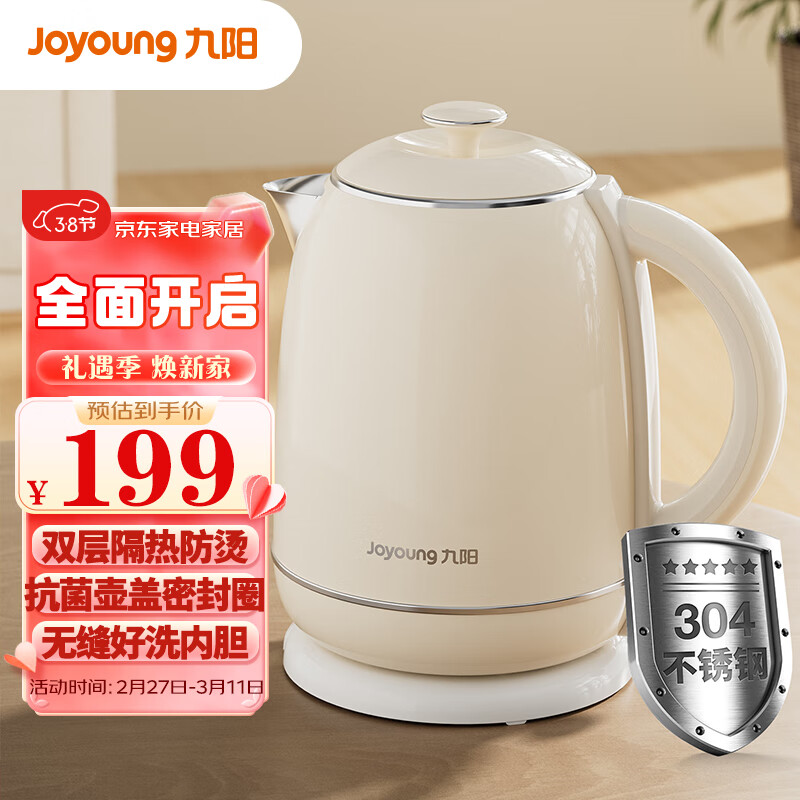 九阳(Joyoung)热水壶烧水壶电水壶1.5L 双层隔热304不锈钢无缝内胆 轻复古家用开水壶K15FD-W550价格:199.00元!