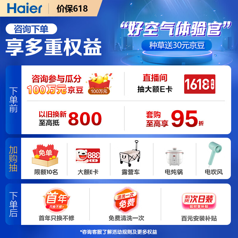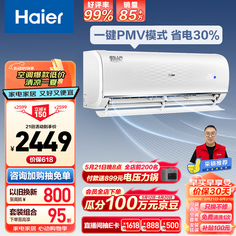 海尔 静悦1.5匹 新一级能效 变频 冷暖 卧室 壁挂式空调 挂机 节能省电 KFR-35GW/01KGC81U1以旧换新价格:2449.00元!