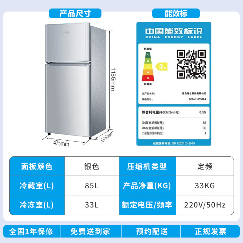 海尔(Haier)118升小型两门迷你小冰箱 节能省电冷藏冷冻双门家用宿舍租房冰箱办公室节能环保电冰箱价格:799.00元!