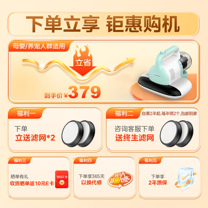 美的(Midea)除螨仪家用手持除螨机 紫外线电击除螨除菌 床上去螨虫大吸力吸尘 MX3小闪电【520礼物】价格:379.00元!