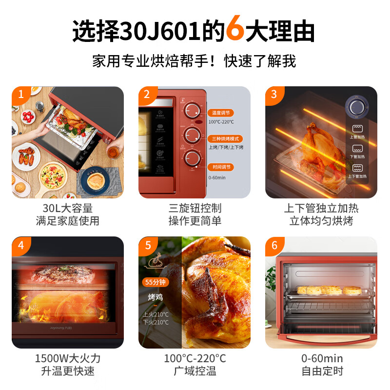 九阳(Joyoung) 家用多功能电烤箱 易操作精准温控60分钟定时 30升大容量KX-30J601价格:178.00元!
