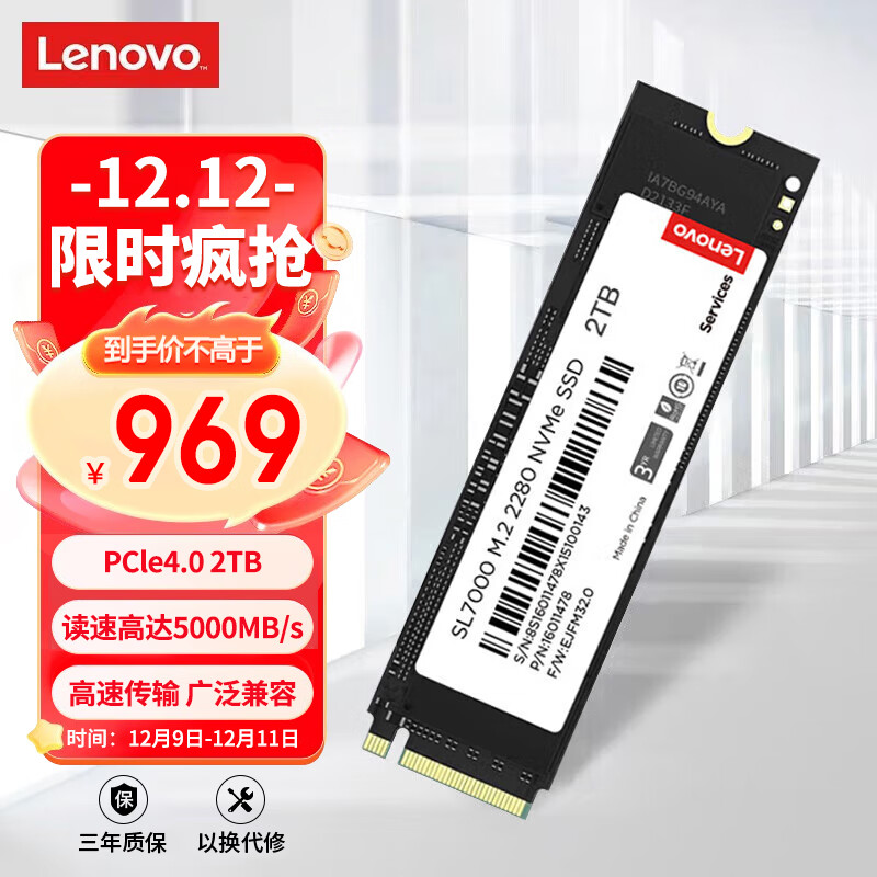 联想(Lenovo) 2TB SSD固态硬盘m.2接口(NVMe协议)pcie4.0 SL7000系列 读速高达5000MB/s价格:969.00元!