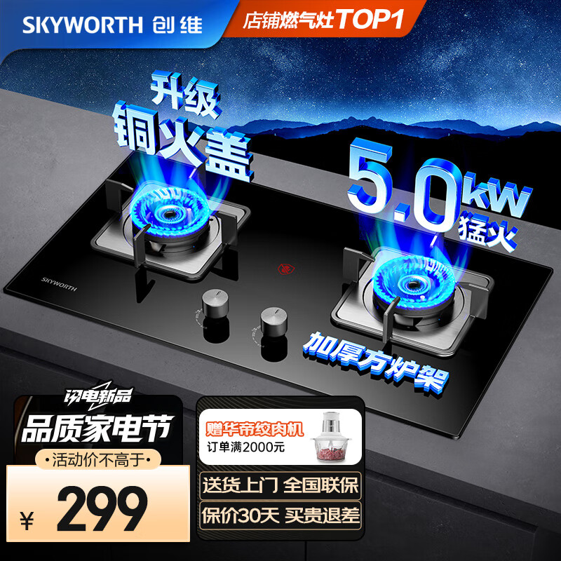 创维(Skyworth)燃气灶双灶家用天然气 5.0kW猛火灶具 台式嵌入式 钢化玻璃大火力灶台 Z50BS-1(液化气)价格:299.00元!