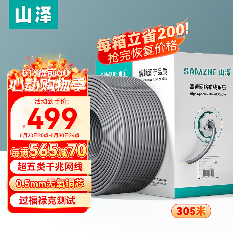 山泽超五类千兆网线【工程版0.5mm无氧铜线芯】CAT5e类非屏蔽 家装网络布线监控POE供电305米SZ-5305A价格:569.00元!