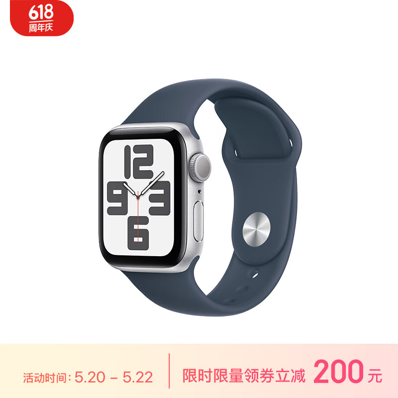 Apple/苹果 Watch SE 2023款智能手表GPS款40毫米银色铝金属表壳风暴蓝色运动型表带M/L MRE23CH/A价格:1999.00元!