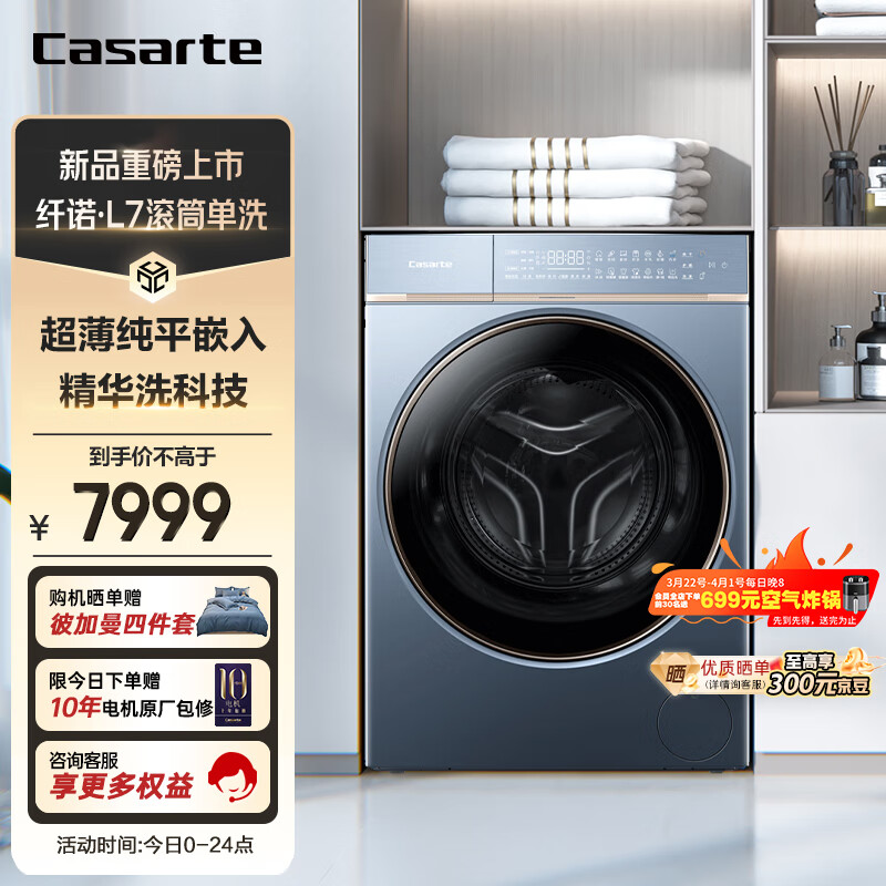 卡萨帝(Casarte)纤诺L7滚筒洗衣机全自动 10公斤直驱变频 525大筒径超薄纯平嵌入 精华洗科技 C1 D10L7ELU1价格:7999.00元!