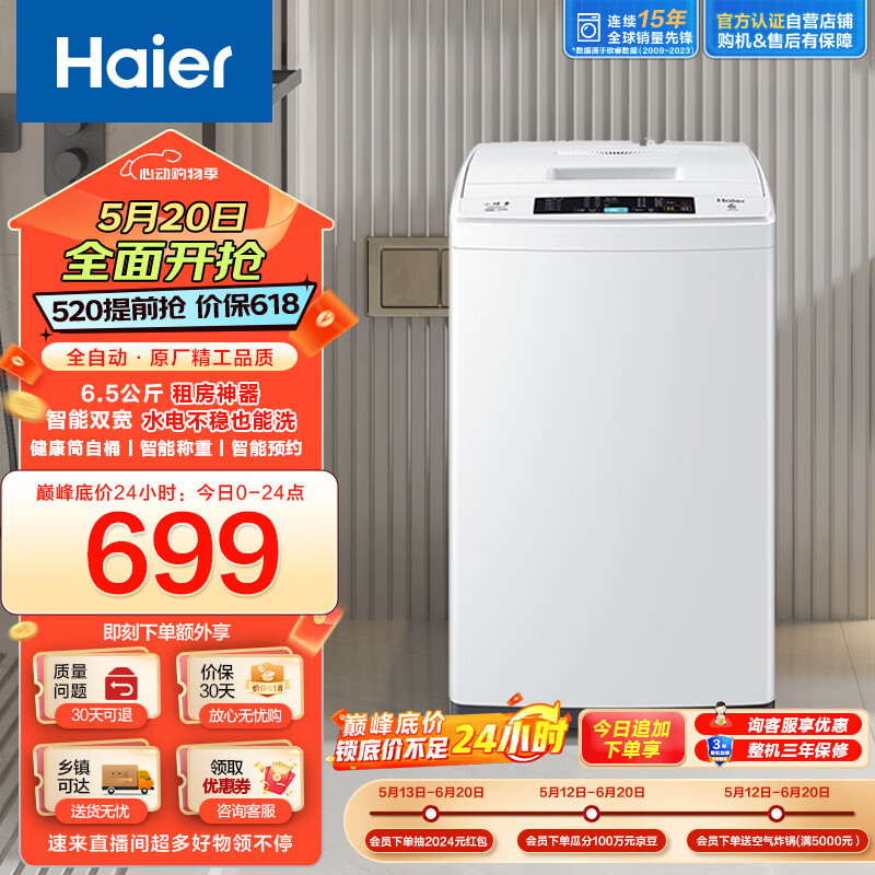 海尔(Haier)波轮洗衣机小型全自动家用 6.5公斤 四重净洗 智能称重 宿舍出租房神器 以旧换新EB65M019价格:699.00元!