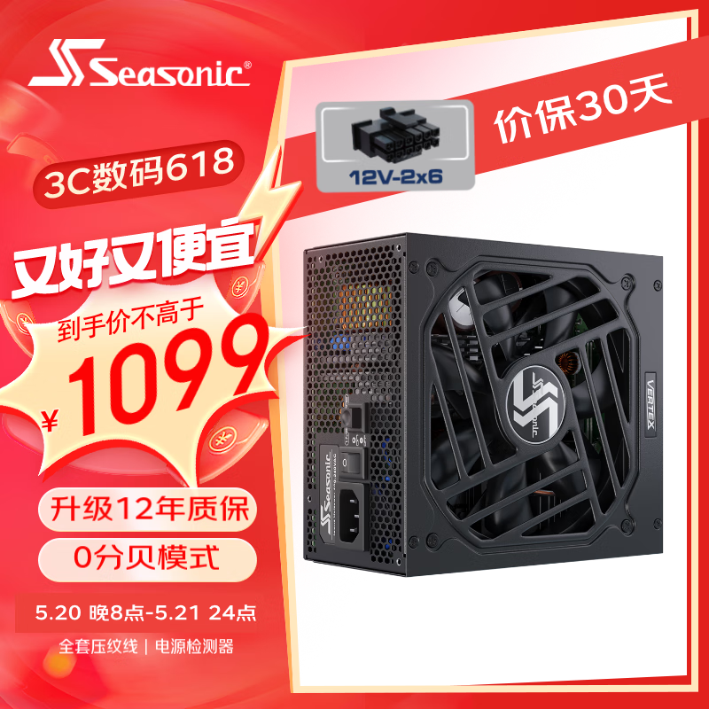 SEASONIC海韵VERTEX GX1000W电源 ATX3.0峰睿金牌 压纹线PCIe5.0 16-pin线12VHPWR支持4090价格:1099.00元!
