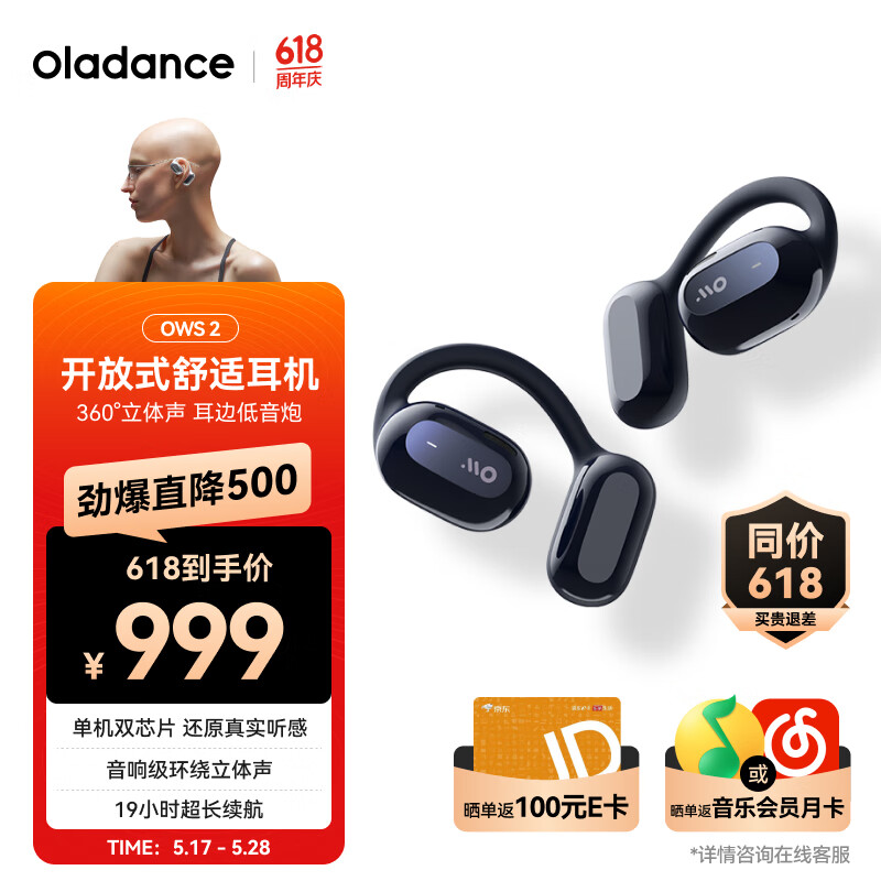 Oladance OWS2全开放式耳机适用苹果华为无线蓝牙不入耳防漏音通话清晰超长续航 深蓝环礁价格:999.00元!