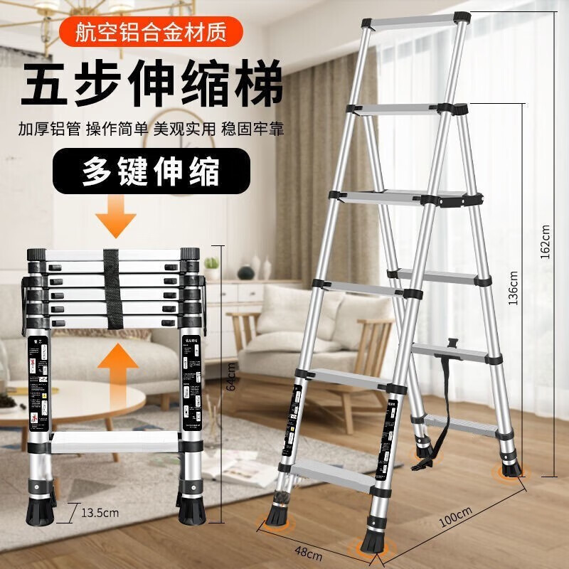 工来工往梯子伸缩梯家用梯人字梯折叠梯子铝合金工程梯多功能升降登高爬梯 一键伸缩5+6步梯价格:349.00元!