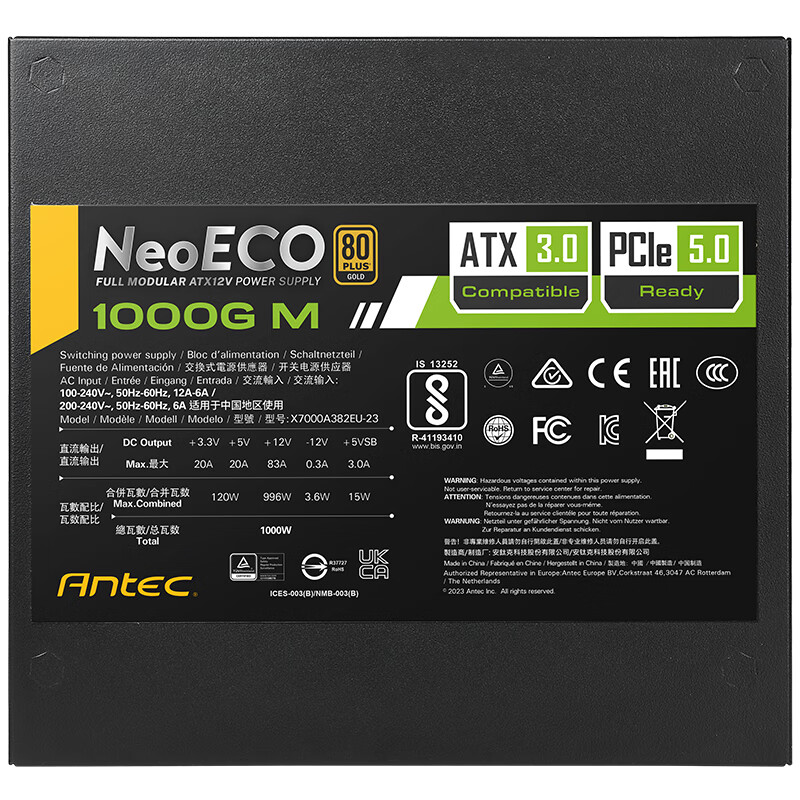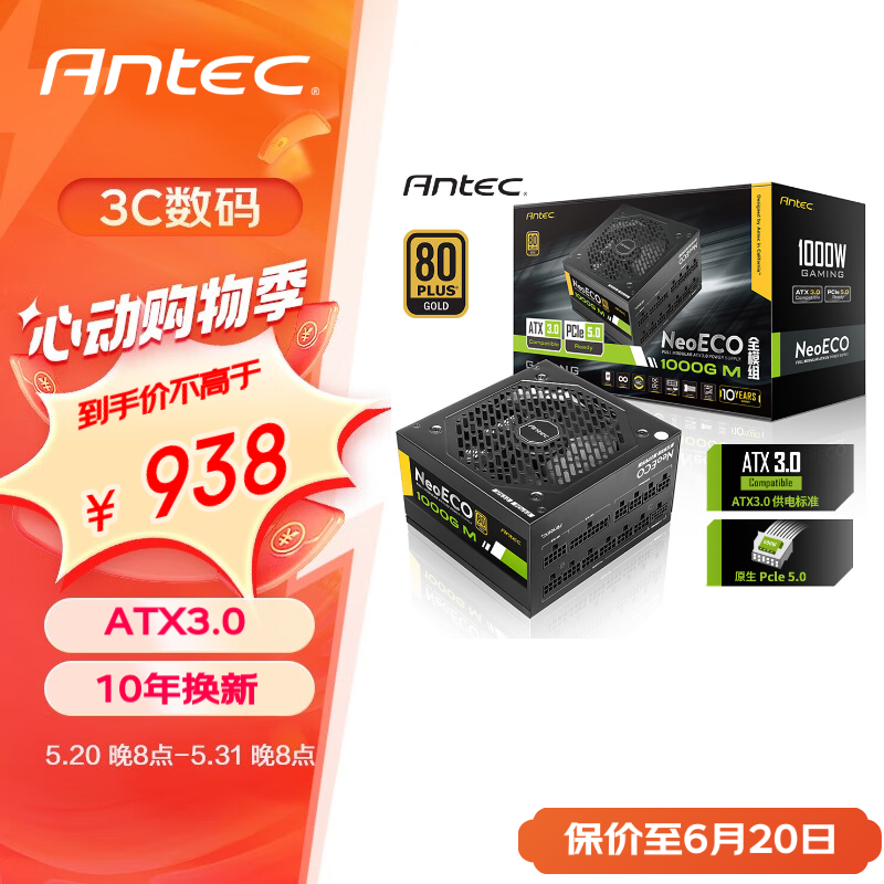 安钛克 Antec NE1000W金牌全模组/ATX3.0/原生PCIe5.0/支持40系显卡/全日系电解电容/双8pin电脑主机电源价格:938.00元!