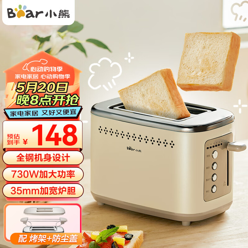 小熊(Bear)面包机 多士炉 烤面包机 早餐自动家用小型烤吐司机馒头不锈钢烤神器 DSL-C02M6丨不锈钢包边+6挡烘烤+配防尘盖价格:148.00元!