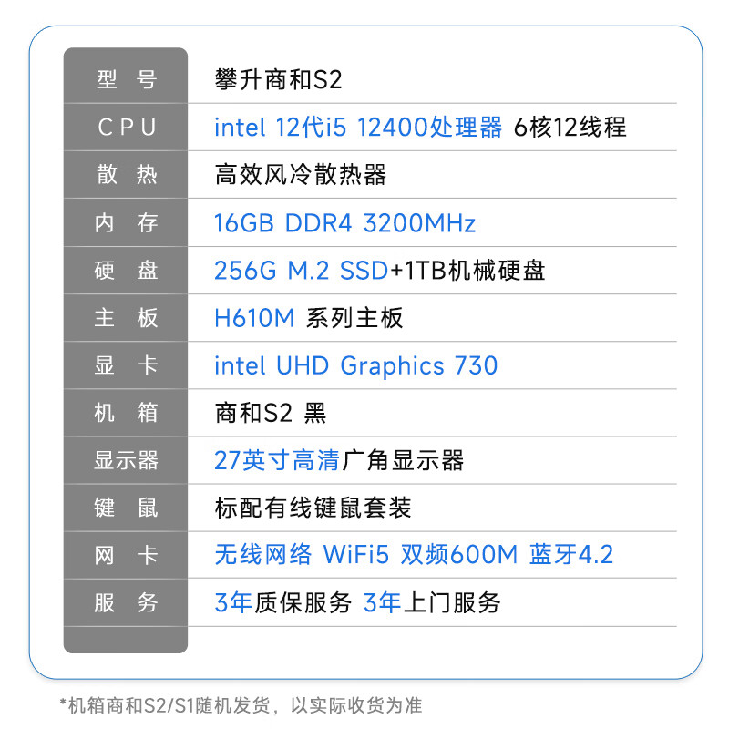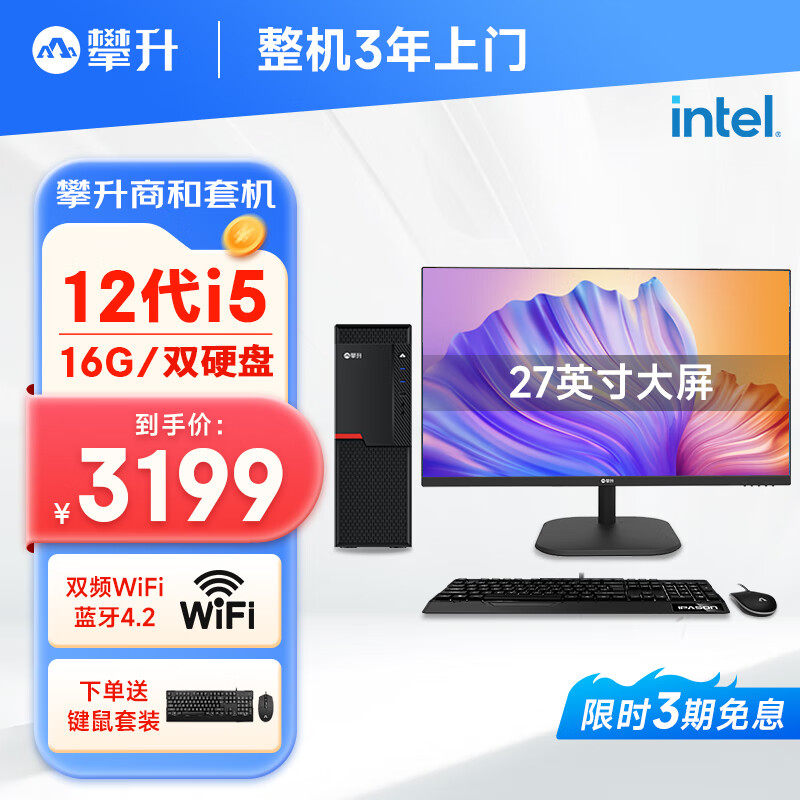 攀升商和S2 办公商用台式电脑主机(i5-12400 16G 256G+1TB WiFi 键鼠 3年上门)27英寸整机diy组装机价格:3199.00元!