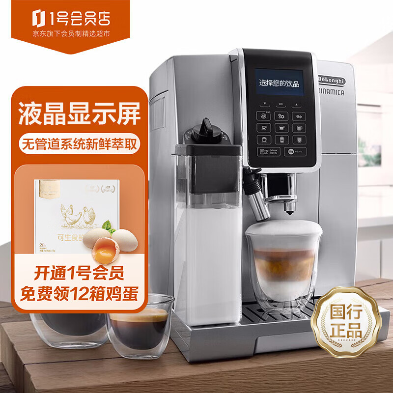 德龙Delonghi 全自动咖啡机双锅炉自动奶泡一键卡布基诺中文显示 ECAM350.75.S 银色 1号会员店价格:6990.00元!