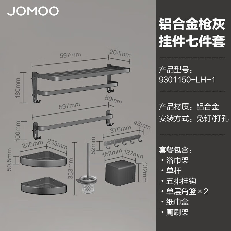 九牧(JOMOO)浴室免钉挂件套装毛巾浴巾架太空铝置物套装枪灰7件 9301150-LH-1价格:329.00元!