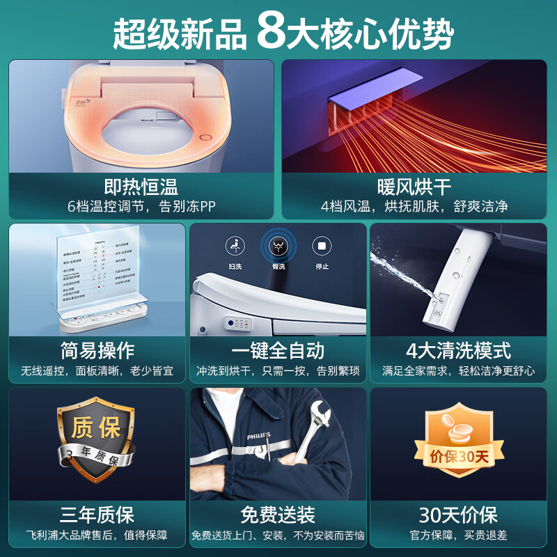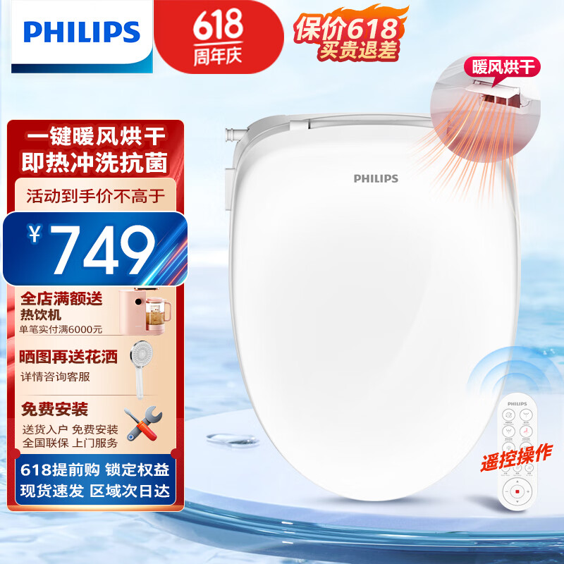 飞利浦(PHILIPS)智能马桶盖暖风烘干即热清洗座圈加热全自动智能坐便盖AIB2216价格:899.00元!