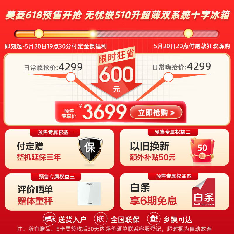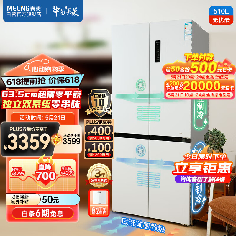 美菱(MeiLing)510升十字双开对开四开门超薄零嵌入式冰箱家用无霜一级变频双系统双循环大容量BCD-510WP9CZX白色价格:3699.00元!
